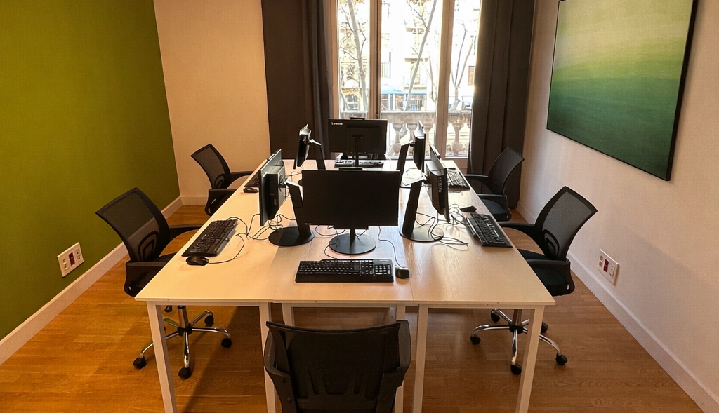 Entornos preparados para presentaciones y encuentros con clientes, con equipamiento profesional para reuniones presenciales y virtuales.